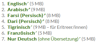 Ehrenamtler haben eine Plattform ins Leben gerufen, wo man erste Sprachkenntnisse erwerben kann, indem man sich mp3s herunterlädt und/oder anhört (z. B. auf dem Smartphone). Dazu gibt es ein Arbeitsblatt (pdf) in der Muttersprache, z. B. Tigrinya oder Arabisch: